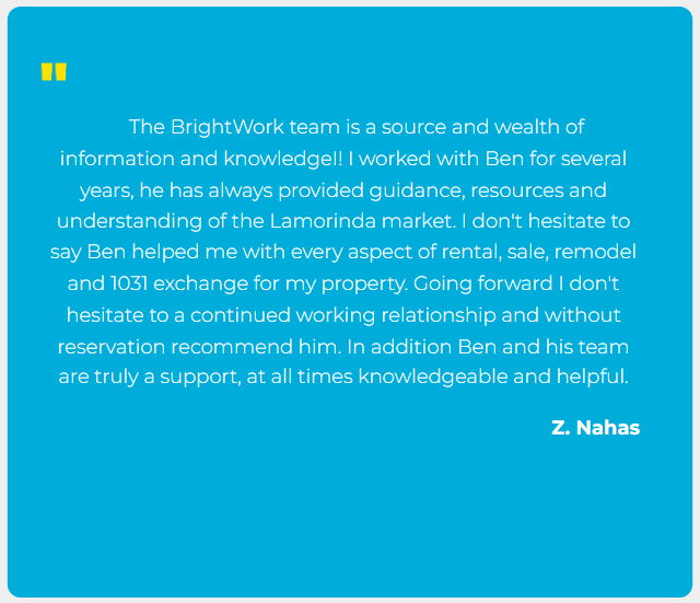 The BrightWork team is a source and wealth of information and knowledgeI! I worked with Ben for several years, he has always provided guidance, resources and understanding of the Lamorinda market. I don't hesitate to say Ben helped me with every aspect of rental, sale, remodel and 1031 exchange for my property. Going forward I don't hesitate to a continued working relationship and without reservation recommend him. In addition Ben and his team are truly a support, at all times knowledgeable and helpful.
