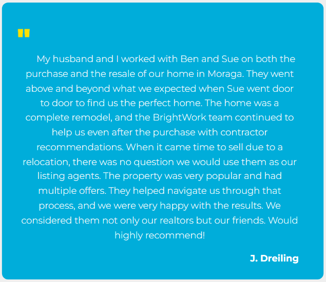 My husband and I worked with Ben and Sue on both the purchase and the resale of our home in Moraga. They went above and beyond what we expected when Sue went door to door to find us the perfect home. The home was a complete remodel, and the BrightWork team continued to help us even after the purchase with contractor recommendations. When it came time to sell due to a relocation, there was no question we would use them as our listing agents. The property was very popular and had multiple offers. They helped navigate us through that process, and we were very happy with the results. We considered them not only our realtors but our friends. Would highly recommend!