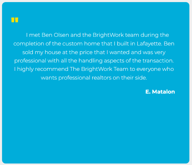 I met Ben Olsen and the BrightWork team during the completion of the custom home that I built in Lafayette. Ben sold my house at the price that I wanted and was very professional with all the handling aspects of the transaction. I highly recommend The BrightWork Team to everyone who wants professional realtors on their side.